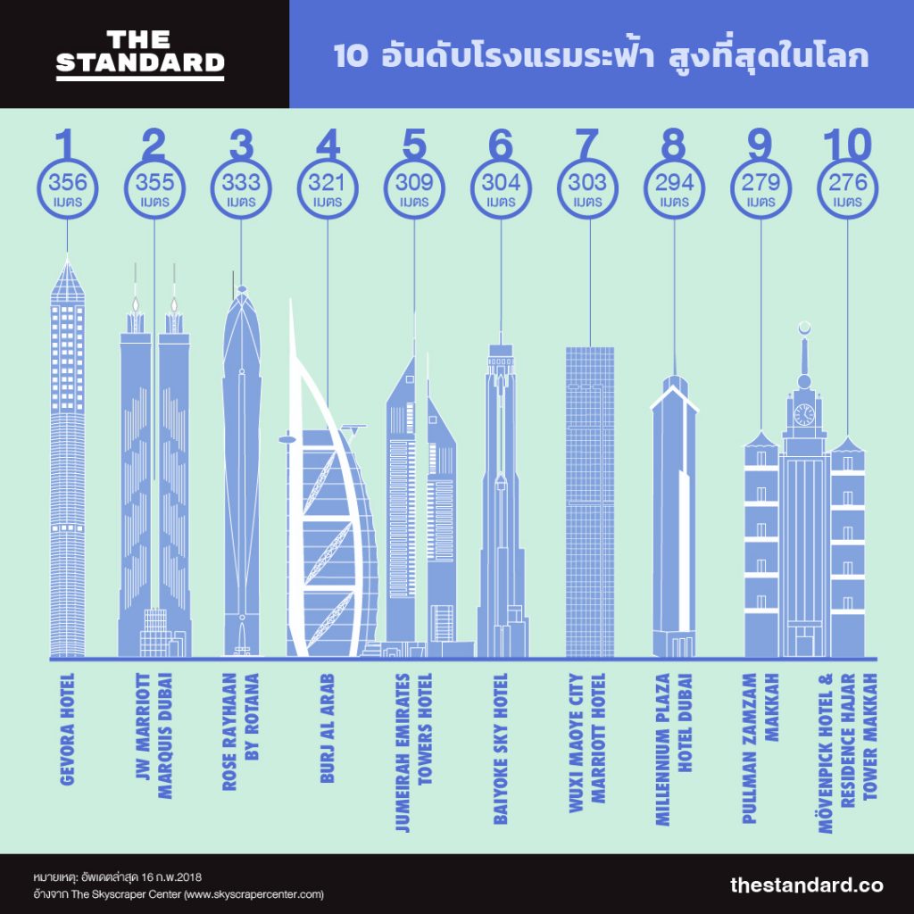 - ลิสต์ 10 อันดับโรงแรมที่สูงที่สุดในโลก อ้างอิงจาก The Skyscraper Center อัปเดตล่าสุด 16 กุมภาพันธ์ 2018