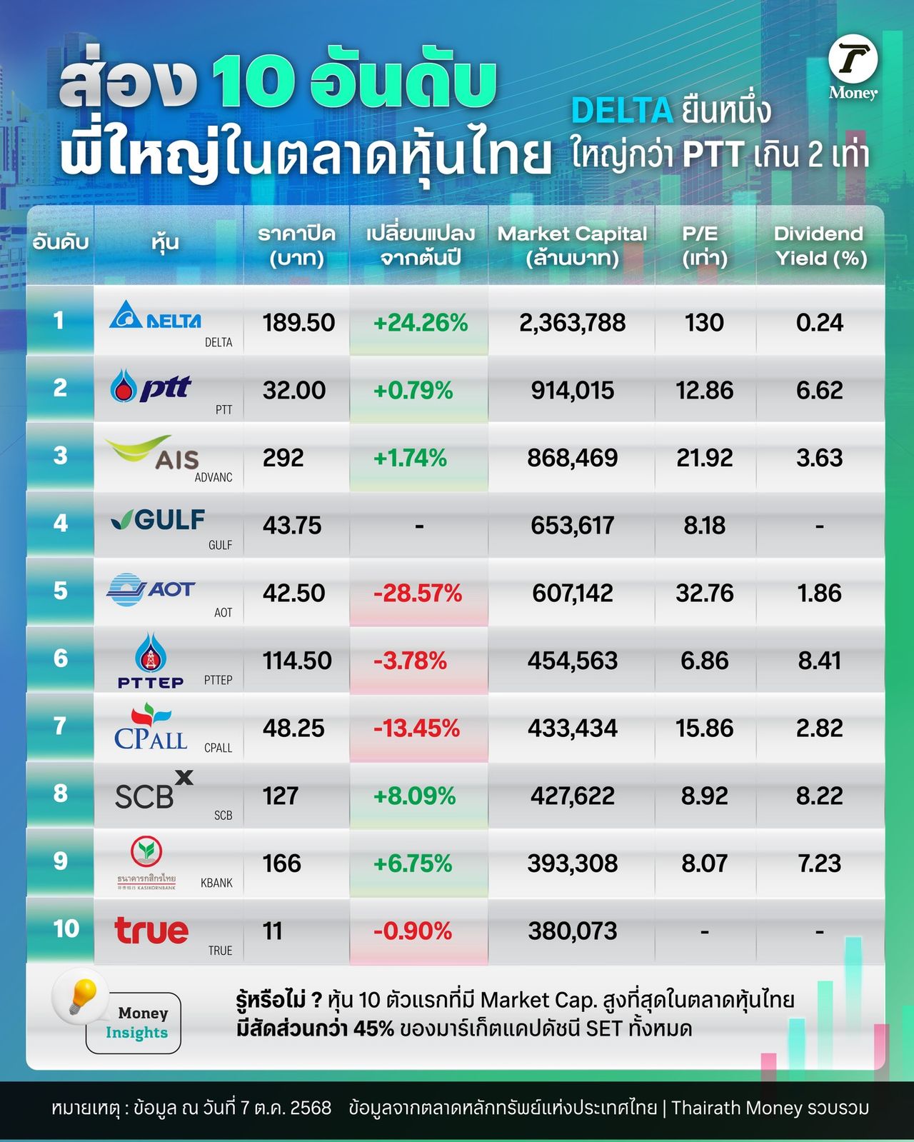 Thairath Money รวบรวมข้อมูลของ 10 บริษัทที่ใหญ่ที่สุดในตลาดหุ้นไทย ทั้งในแง่ของธุรกิจที่ทำ และตัวเลขทางการเงินที่สำคัญ พบ DELTA ก้าวขึ้นมาเป็นบริษัทที่มีมูลค่าสูงสุดนับตั้งแต่ปี 2566 แซงหน้าหุ้นอย่าง PTT ที่เป็นอันดับสอง ไปกว่าเท่าตัว- กก+ กLightฟังข่าว