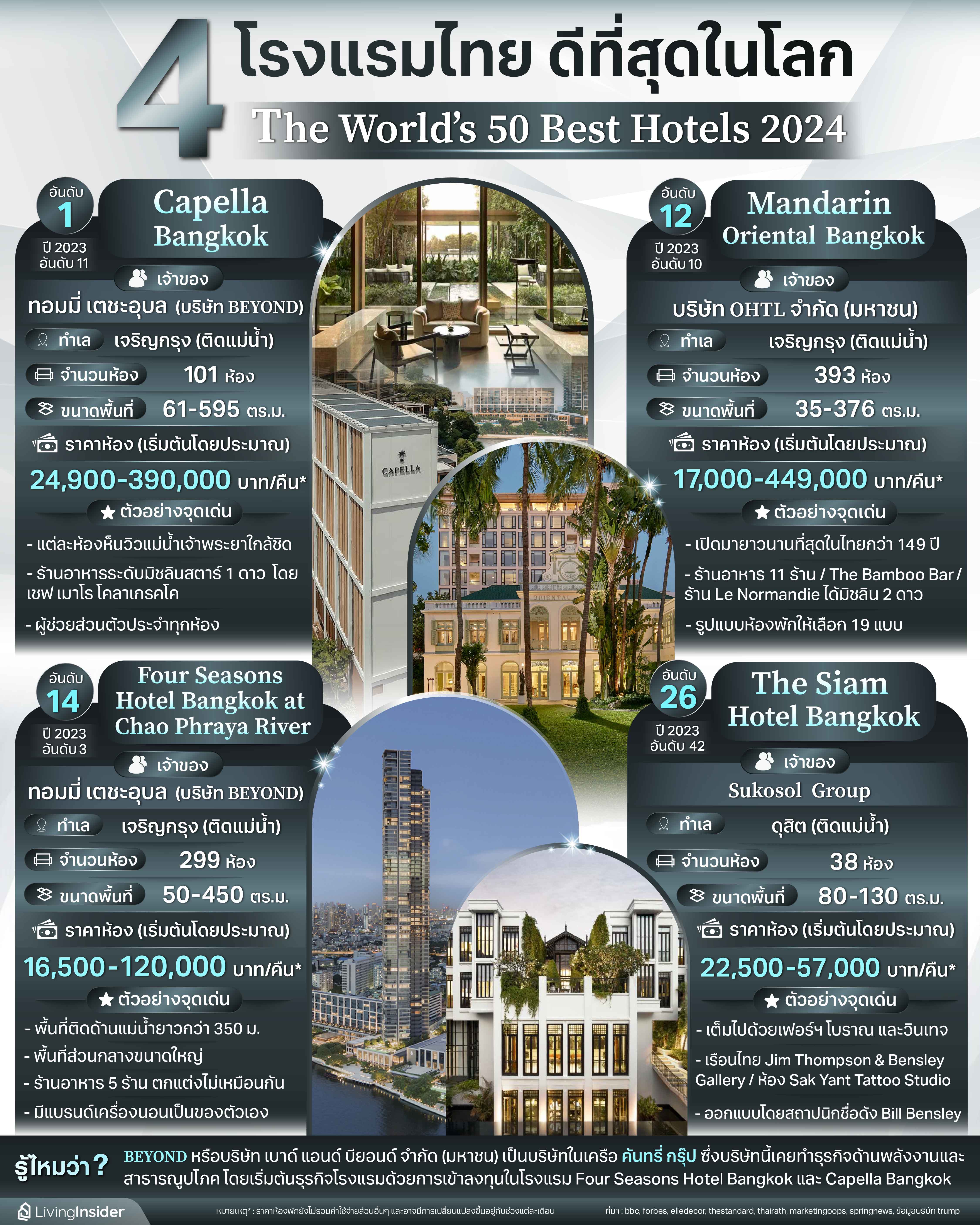 โรงแรมไทย ไม่แพ้ชาติใดในโลก คือเรื่องจริงเลย!! เพราะติดอันดับ Top 1 ของโลก โรงแรมที่ดีที่สุด โดยตกเป็นของโรงแรม Capella Bangkok และยังมีอีกถึง 3 โรงแรม ที่ติดหนึ่งใน Top 50 จาก The World’s 50 Best Hotels 2024