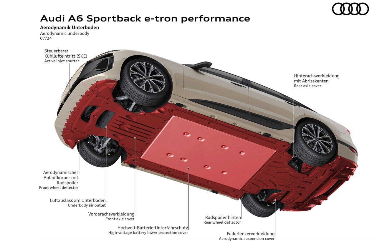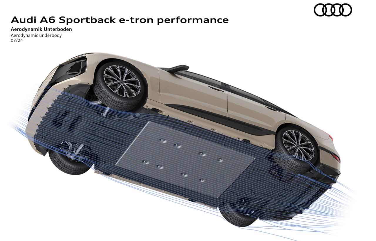 ใต้ท้องรถท่ีปิดทึบ ทำให้ประสิทธิภาพด้านอากาศพลศาสตร์ของ A6 Sportback e-tron อยู่ในระดับแนวหน้า ขอบของดิฟฟิวเซอร์ด้านหลังที่ออกแบบให้สามารถแยกจากกันได้ เป็นอีกจุดที่ส่งผลดีต่ออากาศพลศาสตร์ของรถ เนื่องจากใต้พื้นรถที่เรียบจะทำให้อากาศไหลผ่านได้อย่างสม่ำเสมอ ไม่มีการหมุนวนหรือสร้างความปั่นป่วน