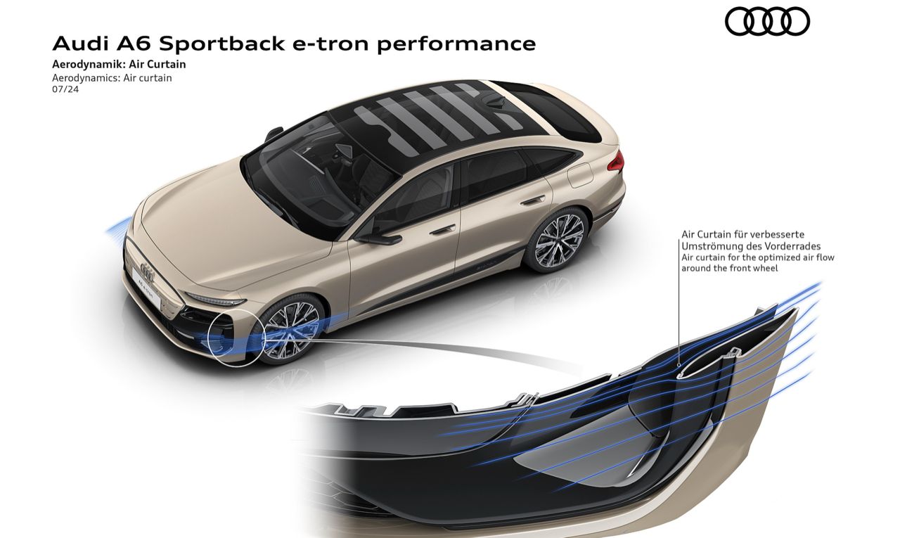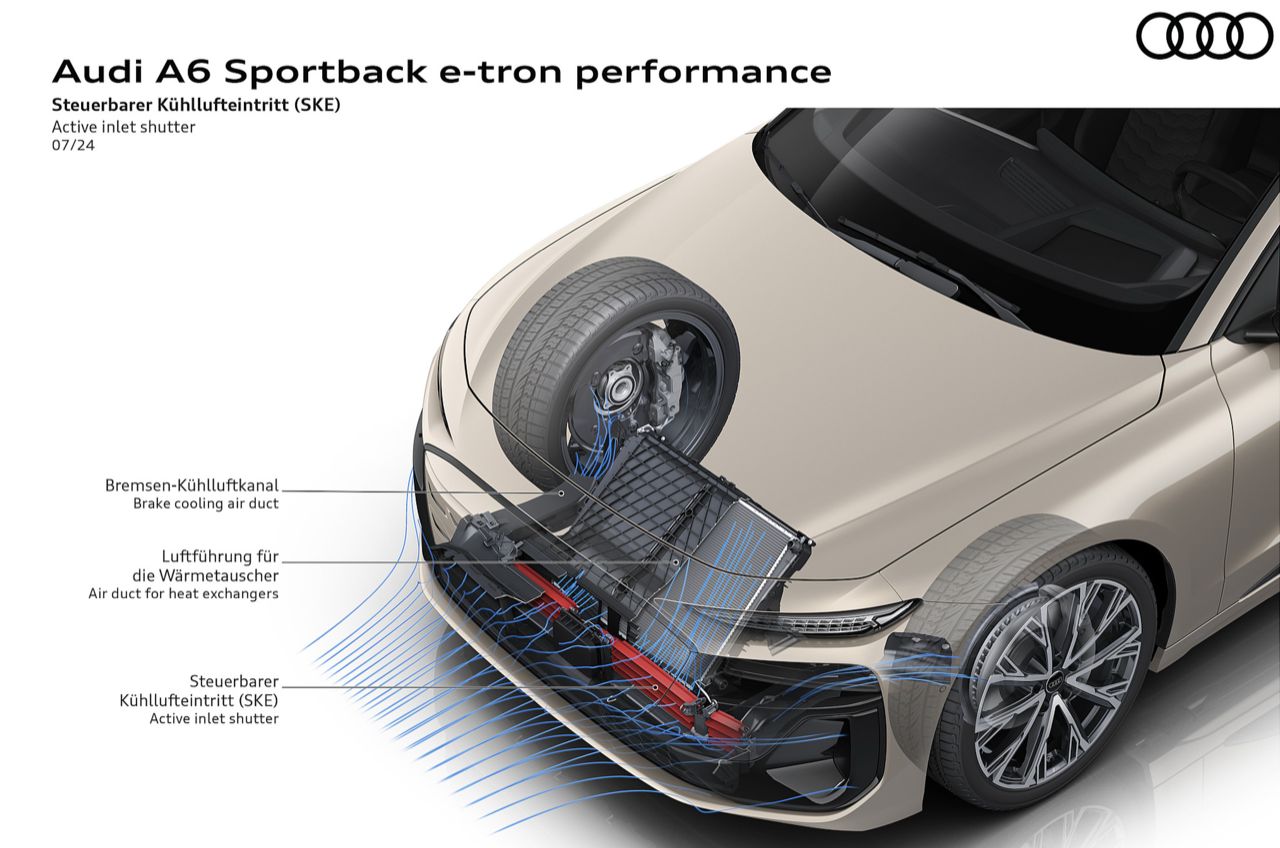 รถ Audi ทุกรุ่นในปัจจุบันมีขนาดใหญ่กว่าเดิม ขอบล้อที่ออกแบบใหม่เพียงอย่างเดียว เพิ่มระยะทางได้ 8 กิโลเมตร ซึ่งถือเป็นข้อได้เปรียบจากรายละเอียดการออกแบบเพียงจุดเดียวเท่านั้น เมื่อทุกอย่างลงตัวและเสร็จสิ้นการปรับแต่งระบบอากาศพลศาสตร์ A6 Sportback e-tron ก็บรรลุค่าสัมประสิทธิ์แรงเสียดทานที่ตัวเลข 0.21 การทำตัวเลขค่าสัมประสิทธิ์แรงเสียดทานที่ต่ำมากของ A6 Sportback e-tron1 รวมถึง A6 Avant e-tron ดีไซเนอร์ให้ความสำคัญกับรายละเอียดต่างๆ ช่องรับอากาศเย็นแบบสวิตช์เบลด ใต้ Singleframe เพียงช่องเดียว ช่วยให้อากาศไหลผ่านจุดนี้ได้โดยสูญเสียค่าสัมประสิทธิ์แรงเสียดทานเพียงเล็กน้อยเท่านั้น จุดดังกล่าว ทำให้มีค่าสัมประสิทธิ์แรงเสียดทาน (Cd) เพิ่มขึ้นอีก 0.012 ซึ่งเทียบเท่ากับเสียระยะทางไปประมาณ 12 กิโลเมตร