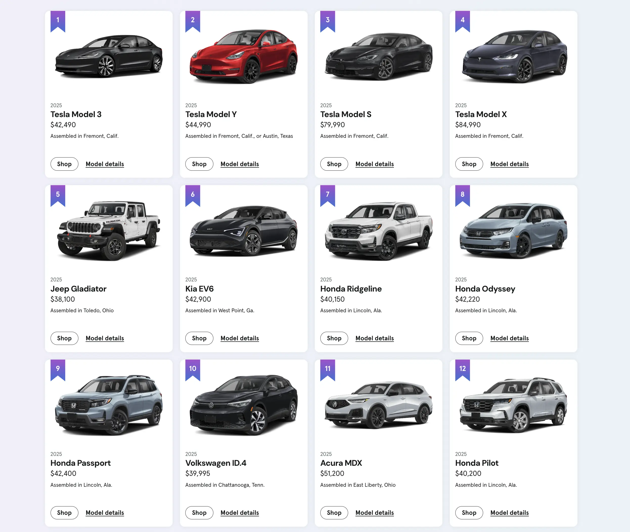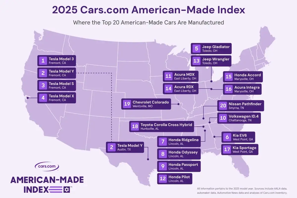Cars.com ได้ประกาศผลการจัดอันดับ American-Made Index (AMI) ประจำปี 2025 แล้ว พบว่า Tesla ก็ยังคงครองอันดับต้นโดยกวาด 4 อันดับแรกด้วย 4 รุ่น และถือเป็นปีที่ 4 ติดต่อกันที่ Tesla เป็นแบรนด์รถยนต์ที่ผลิตในอเมริกามากที่สุด