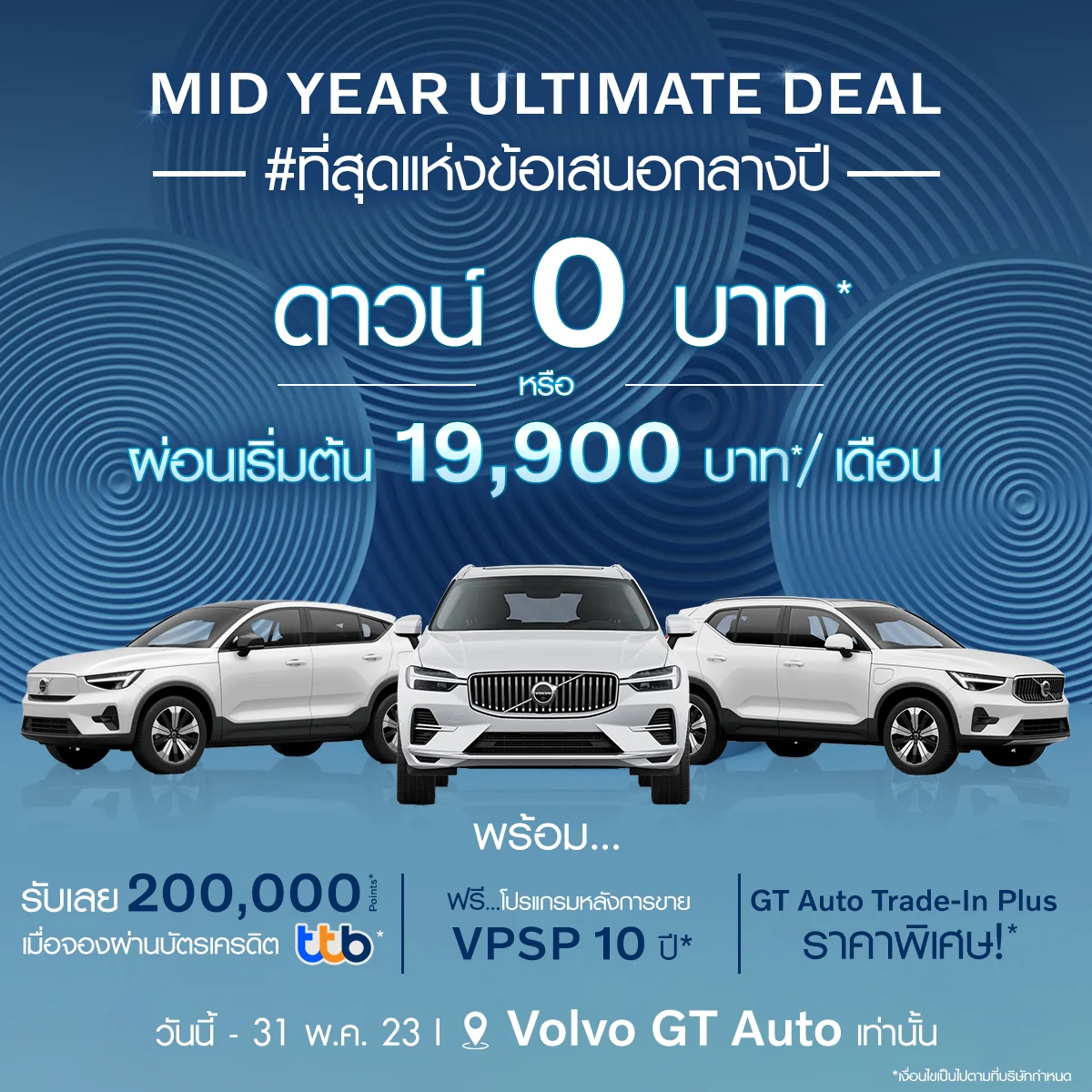 ดังนั้น เพื่อฉลองความสำเร็จดังกล่าว GT Auto จึงได้จัดโปรโมชั่น ‘MID YEAR ULTIMATE DEAL’ สำหรับลูกค้าที่สนใจในรถยนต์ Volvo พร้อมข้อเสนอพิเศษอีกมากมาย อาทิ