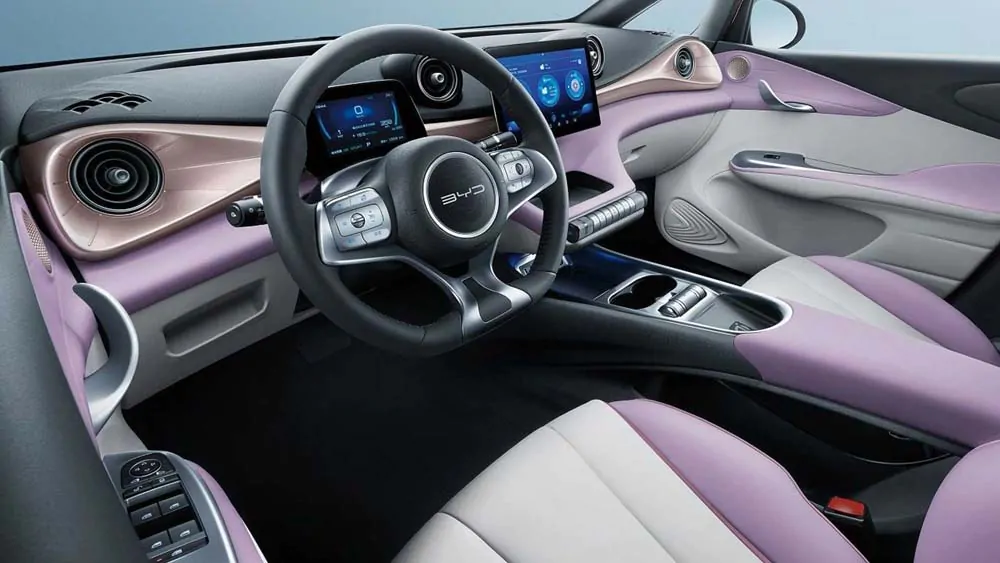 หากเทียบกับรถยนต์ Segment เดียวกันอย่าง ORA Good Cat เจ้า Dolphin คันนี้จะมีขนาดเล็กกว่าประมาณหนึ่งครับ การออกแบบภายในก็มากับดีไซน์สีทูโทนแบบเดียวกับภายนอก ทั้งคันรถจะเห็นเส้นดีไซน์ที๋โค้งมน รถเลยออกมาดูน่ารักและกะทัดรัดครับ พวงมาลัยเป็นแบบ Multifunction และเบาะนั่งเป็น Bucket Seat ทรงสปอร์ต เป็นเบาะไฟฟ้าที่สามารถปรับทิศทางได้