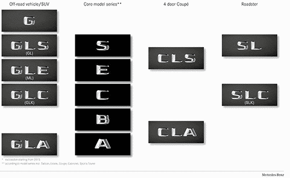 ในปี 2015 บริษัท Mercedes Benz ได้มีการปฏิวัติจัดระบบการตั้งชื่อรุ่น Models ใหม่ทั้งหมด เพื่อความเป็นระเบียบมากขึ้น ให้ผู้ขับขี่รถเบนซ์ทุกคนเข้าใจ และจดจำความหมายของรถเบนซ์แต่ละรุ่นได้ง่ายยิ่งขึ้นกว่าเดิม ซึ่งระบบใหม่ที่ Mercedes Benz จัดออกมามีทั้งหมด 4 Series ด้วยกันคือ Core Model Series, Crossover / SUV / Off-road, 4-Door Coupé และ Roadster