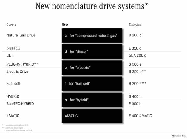 นอกจากชื่อรุ่น Series ต่าง ๆ แล้ว Mercedes Benz ยังมีการตั้งชื่อระบบพลังงานใหม่ให้ง่ายกว่าเดิมโดยใช้ตัวอักษร ดังนี้
