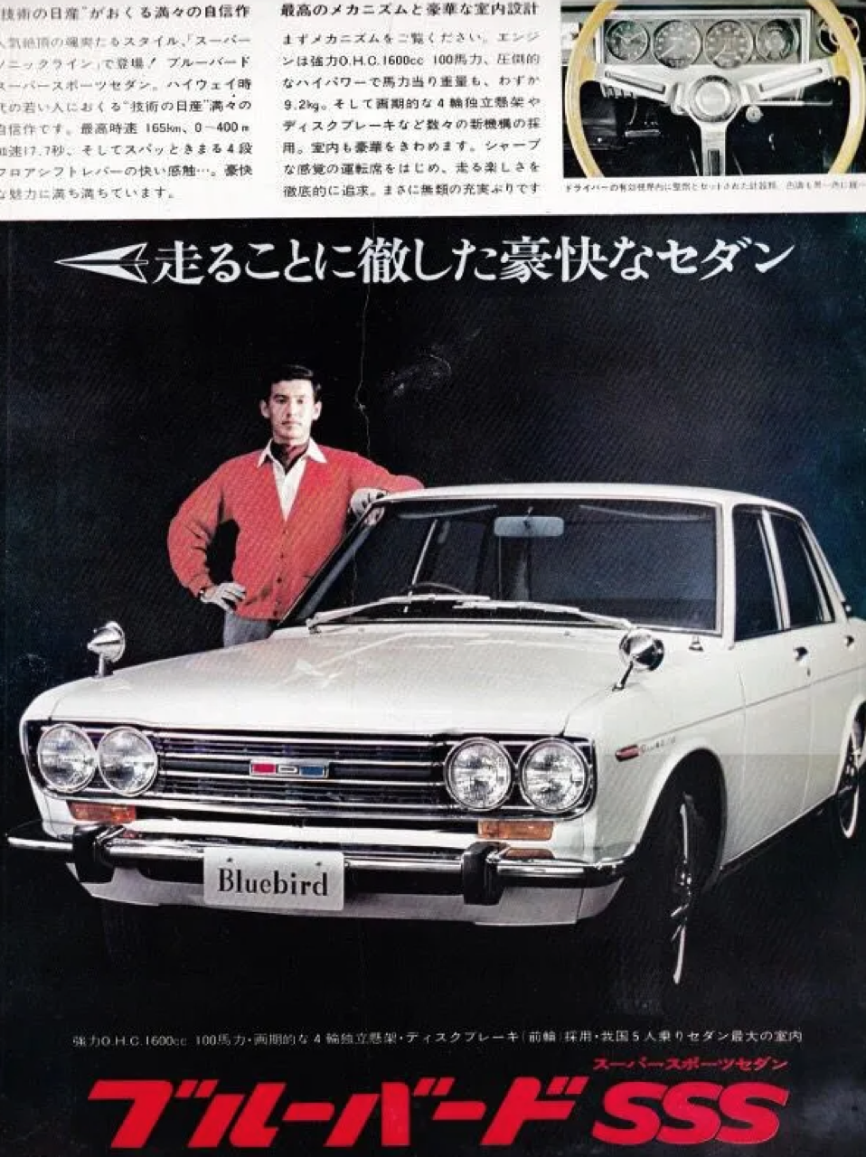 รูปลักษณ์ที่คล้ายกับรถสปอร์ตต้นตระกูลของ Nissan GT-R (C10) คือรถที่มีชื่อว่า “BMW เพื่อคนจน” Datsun 510 Bluebird ใช้ไฟหน้าทรงกลม ตัวถังสื่อให้เห็นถึงเทคนิคของการออกแบบในยุคที่คาร์บูเรเตอร์ยังคงยิ่งใหญ่ โดยภาพรวม มันเป็นรถที่โฉบเฉี่ยวใช้ได้ หลายคนยังคงปักใจเชื่อว่าแรงบันดาลใจในการออกแบบของรถคันนี้ก็คือ BMW 2002 tii รุ่นดั้งเดิมที่อยู่ในใจผู้ที่ชื่นชอบความเร็วในยุค 70 ด้วยความงามที่เรียบง่ายแต่ซับซ้อน 510 ได้รับความนิยมจากไดนามิกที่สมดุลของมัน เครื่องยนต์ 4 สูบแถวเรียง 1.6 ลิตร ให้กำลัง 96 แรงม้า ทำความเร็วสูงสุด 160 กิโลเมตรต่อชั่วโมง คุณสมบัติที่ยอดเยี่ยมอีกอย่างของ Datsun 510 Bluebird คือตัวเลขการกระจายน้ำหนักที่สมดุล 50-50 ซึ่งซีดานสมัยใหม่จำนวนมากในปัจจุบันโดยเฉพาะพวกรถขับหน้าก็ยังไม่สามารถทำตัวเลขที่สมมาตรแบบนั้นได้ กว่าห้าสิบปีที่ผ่านมา รถญี่ปุ่นที่น่ารักรุ่นนี้ ได้กลายเป็นไอคอนของนักเลงรถเก่า ด้วยรูปลักษณ์แบบกล่องสี่เหลี่ยมอันเป็นเอกลักษณ์ 510 Bluebird นำความสำเร็จมาสู่แบรนด์รถยนต์ญี่ปุ่นด้วยประสิทธิภาพที่ดีพอและราคาที่คนทั่วไปสามารถเอื้อมถึงได้อย่างไม่ยากเย็นนัก